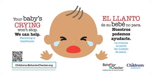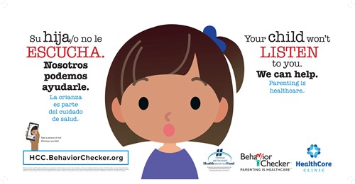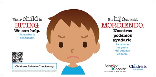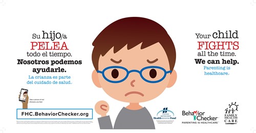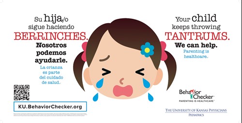 Large wall posters, 26 X 13, help promote Behavior Checker throughout the clinic. There are five in English and Spanish, each featuring an example behavior:Tantrums, Biting, Crying, Won't Listen and Fighting.